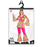 Das Retro-Damenkostüm kommt in kräftigen, bunten Farben und besteht aus Oberteil, Hose und Stirnband. Die weit ausgestellten Schlaghosen und das schrille Muster des Karneval Damenkostüms werden die Blicke scharenweise auf sich ziehen - und das nicht nur auf dem Dancefloor! Komplettieren Sie Ihr Retro-Kostüm noch mit passenden Accessoires wie Disco Brille, Halskette oder einer 60er oder 70er Jahre Perücke (nicht im Lieferumfang enthalten) und machen Sie die nächste Mottoparty, Karnevalsparty, Kostümparty oder auch ein Festival unsicher mit diesem fantastischen Party-Kostüm.