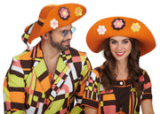 Der Hut ist aus einem weichen Wollfilz in Orange gearbeitet und mit einem zum Kostüm Andy passenden Tuch versehen. Durch die bunten Blumen wird der Retro Hut zu einem absoluten Blickfang. Der hochwertig gearbeitete Hut ist für Damen und Herren geeignet.