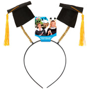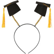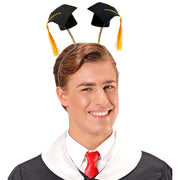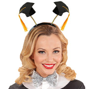Der Haarreif ist mit zwei kleinen, schwarzen Absolventenhüten versehen, die auf goldfarbenen Spiralfedern angebracht sind. Durch diese Befestigung wippen die Hüte bei jeder Bewegung leicht mit, was dem Träger oder der Trägerin einen dynamischen und spielerischen Look verleiht. Die klassischen, goldgelben Quasten verleihen dem Design eine authentische Optik und machen das Accessoire zu einem echten Hingucker.