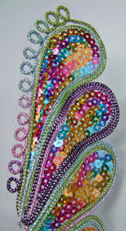 Die Maske besteht aus Kunststoffmaterial und wurde mit glitzernden Ornamenten und vielen bunten Pailletten besetzt. Sie wird mit einem schmalen Satinband am Hinterkopf gebunden.
