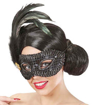 Die Maske ist aus Textilmaterial hergestellt und aufwändig mit Pailletten, einer Zierbrosche und Federn sehr schön verziert. Sie wird mit einem schmalen Gummiband getragen und passt zu vielen Kostümen aus den Bereichen Karneval in Venedig, Historische Barock und Rokoko Kostüme, Show und Glamour sowie auch zum Junggesellinnenabschied, Halloween oder Gothic Kostüm.