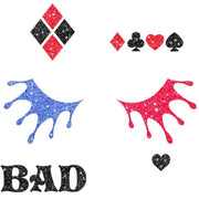 Das kreative Design im klassischen Harlekin-Stil wurde mit modernen Elementen und glitzernden Highlights kombiniert – ideal für einen auffälligen, leicht düsteren Look mit einem Hauch Glamour. Die Sticker betonen Augen, Wangen und Stirn und machen jedes Gesicht zum echten Hingucker.