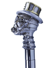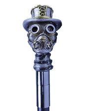 Mit diesem detailreichen Gehstock vervollständigen Sie Ihr Steampunk Kostüm zu Halloween, Fasching oder Mottoparty ganz wunderbar. Der graue Zierknauf stellt einen kleinen Kopf mit Gasmaske, Fliegerbrille und Zylinder mit vielen Details dar. Einzelne Elemente sind mit goldener Farbe abgesetzt. Die Gesamtlänge des Stocks beträgt ca. 93 cm und der Stock hat einen Durchmesser von ca. 2,5 cm. Zur Lärmdämpfung ist am unteren Ende ein Gummipuffer mit einem Zierring angesetzt.