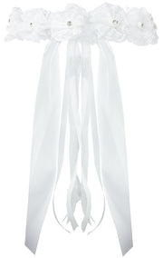 Der Haarkranz ist mit Spitzenrosetten und Strasselementen verziert und eine wunderschöne Alternative zu den Haarkränzen mit Brautschleier. Den Hinterkopf ziert eine große Schleife in Satin Optik. Eine mittig angebrachte Blüte und lange herunterhängende Bänder runden das Gesamtbild perfekt ab.
