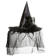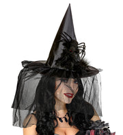 Mit diesem auffälligen Hexenhut wird Ihr Kostüm als Hexe oder Zauberin zu Halloween, Fasching und Karneval ein echter Hingucker. Der ausgefallene Hut ist mit einem langen Schleier, einer großen Spinne und schwarzen Federn besetzt. Der Spitzhut ist aus einem glatten Material hergestellt und schön verziert, ein wirklich stylischer Hexenhut für Damen.