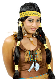 Die Indianerin Perücke hat lange schwarze Haar Zöpfe und ist mit kleinen gelben Bändern verziert!
