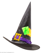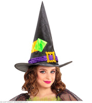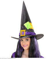 Mit diesem auffälligen Hexenhut wird dein Kostüm als Hexe oder Zauberin zu Halloween, Fasching und Karneval ein echter Hingucker. Der ausgefallene Hut ist aus Satin und Samt hergestellt und mit Flicken und einer großen Schnalle verziert. Ein wirklich stylischer Hexenhut für Kinder.