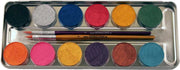 Profi Schminkpalette von Eulenspiegel mit 12 tollen und sehr ergiebigen Farben auf Wasserbasis und zwei Profi-Pinseln. Die Farben sind frei von Parfümstoffen. Lieferumfang: - 12 Perlglanz-Farben á 3,5 ml - 1 Schminkpinsel Größe 3 - 1 Schminkpinsel Größe 4