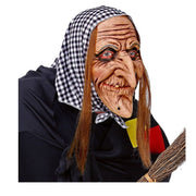 Die Maske zeigt das Gesicht einer alten, gruseligen Hexe mit faltiger Haut, spitzen Warzen, einer krummen Nase und einem finsteren Blick. Langes Kunsthaar und ein klassisches Kopftuch machen den Look besonders authentisch – als wäre sie gerade aus dem düsteren Wald hervorgekrochen.