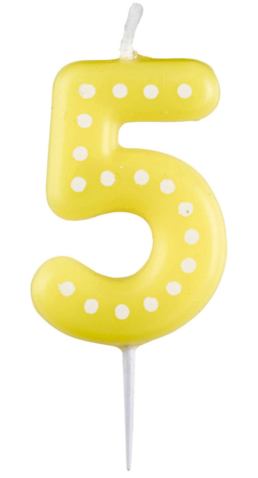 Vollständige Details anzeigenZahlenkerze mit Punkten 6,5cm | Gelb # 5