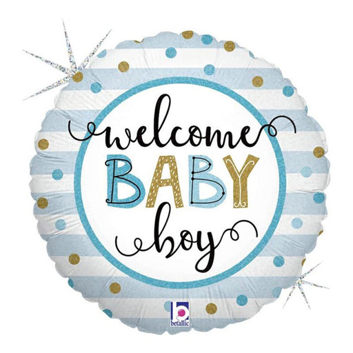 Der runde Folienballon Welcome Baby Boy mit hellblauen Streifen, goldenen Punkten und schimmerndem Holo-Effekt ist ein eleganter Hingucker zur Ge...