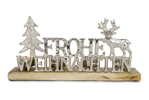 Vollständige Details anzeigenAdventskerzenhalter mit Tanne & Hirsch | Metallmotiv "Frohe Weihnachten" | 30×6,5×15 cm | 12738