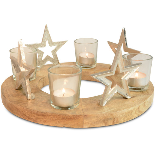 Vollständige Details anzeigenAdventskerzenhalter mit Sternen und Teelichtgläsern Ø 30 cm - Silber 70337 | Adventskranz
