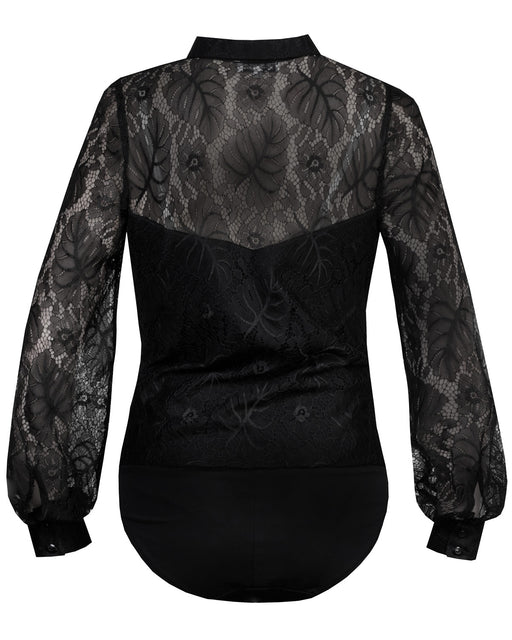 Betörender Blusenbody vom deutschen Hersteller MarJo aus traumhafter Spitze in Nachtschwarz. Der Body begeistert mit zarten Einblicken, Herzausschn...