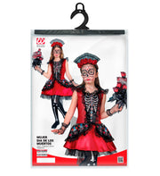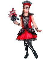 Mit diesem Kostüm Set ist Ihre Tochter ideal für den Dia de los Muertos vorbereitet. Im Lieferumfang enthalten sind das kurze Kleid, die fingerlosen Handschuhe und der Kopfschmuck. Das Kleid ist in einem kräftigen Rot gestaltet und zeigt einen Skelettbrustkorb, welcher mit vielen Totenschädeln und Blumen verziert ist. Ergänzen Sie unser tolles Day of the Dead Halloweenkostüm noch mit etwas Schminke und einem Brautstrauß und Ihre Tochter hat sicher viel Spaß auf der nächsten Kostümparty.