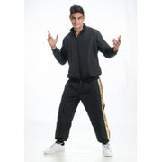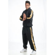 Die Jacke im klassischen Schwarz ist mit auffälligen goldenen Streifen an den Ärmeln und an den Seiten der Hose versehen, was für einen authentischen Rapper-Style sorgt. Das Material ist angenehm zu tragen und bietet viel Bewegungsfreiheit – perfekt zum Tanzen, Rappen oder für coole Posen. Die Hose ist locker geschnitten und unterstreicht den typischen Baggy-Look, der den Hip-Hop-Stil perfekt widerspiegelt.