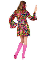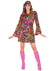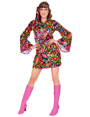 Dieses atemberaubende Disco-Damenkleid der 60er, 70er und Flower-Power Zeit macht nicht nur an Karneval eine gute Figur. Auch auf einer Schlagerparty, bei Festivals und anderen Mottoparties sind Sie damit immer gut angezogen.