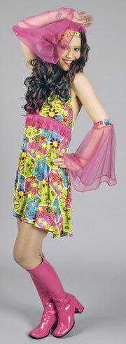 Die schöne Tunika mit Stirnband und Armstulpen im Stil der 70er und 80er Jahre ist aus einem kunterbunten Material mit Blumen und Peace Zeichen hergestellt. Die Armstulpen sind passend zum Rest des Kostümes aus rosafarbenen Tüll gefertigt