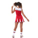 Das Kostüm besteht aus einem einteiligen Kleid in den typischen Cheerleader-Farben Rot, Weiß und Schwarz, das durch blutrote Flecken einen besonders düsteren Touch bekommt. Der gerade geschnittene Saum sorgt für einen sportlichen Look, während die „verlebte“ Optik zeigt, dass du nicht von dieser Welt bist. Ein auffälliger Print auf der Brust unterstreicht das untote Thema und macht klar: Diese Cheerleaderin feuert keine lebenden Spieler mehr an.