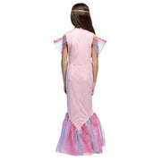 Das lange Kleid ist im typischen Meerjungfrauen-Stil geschnitten und überzeugt durch seine harmonische Farbkombination aus Pink und schimmernden Pastellnuancen. Der Oberteilbereich ist liebevoll gestaltet und wird durch transparente, farbige Ärmel stilvoll ergänzt. Der rockartige Flossenabschluss aus luftigem Tüll verleiht dem Kostüm eine besonders elegante Bewegung und sorgt für einen märchenhaften Auftritt bei jedem Schritt. Abgerundet wird das Outfit durch ein passendes Stirnband, das den Meerjungfrauen-Look perfekt komplettiert.