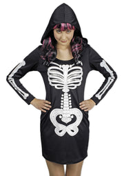 Das kurze Kleid besteht aus einem schwarzen Stoff mit Kapuze und ist mit weißen Knochen bedruckt.