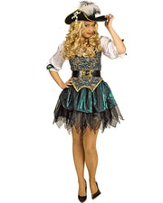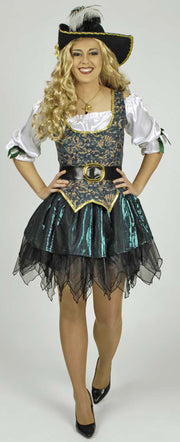 Mit diesem tollen Karnevalskostüm für Damen werden Sie zu einer richtigen Piratin! Das Kostüm besteht aus einem wunderschön gearbeiteten Kleid mit Gürtel. Der Rock des Kleides ist in einem schillernden Ozeangrün mit viel schwarzen Tüll. Das Oberteil des Kleides ist mit goldenen Ornamenten bedruckt. Die Ärmel sind einer weißen Satinbluse nachempfunden. Damit sind Sie perfekt eingekleidet.