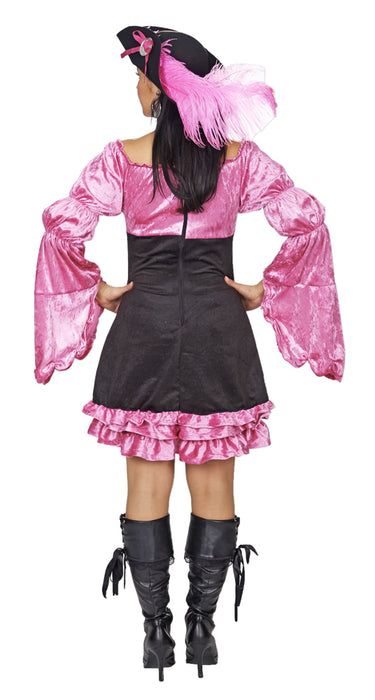 Verwandeln Sie sich in die mutige Piratenbraut und schlüpfen Sie in das Piratenbraut Kleid zu Karneval oder der Mottoparty! Das Kleid ist aus einem pinkfarbenen Samtmaterial hergestellt und besitzt eine kleine schwarze Corsage, welche vorne enger geschnürrt werden kann. Die Ärmel sind ab Ellbogen schön weit ausgestellt, was dem Kleid dadurch etwas Besonderes verleiht.