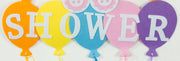 Große, weiße Buchstaben bilden den Schriftzug Baby Shower, bunte Fransen vervollständigen die Dekoration und machen sie zu einem hinreißenden Hingucker.