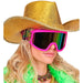 Dank des elastischen, verstellbaren Kopfbands sitzt die Brille sicher und bequem auf dem Kopf oder Helm und eignet sich auch für längere Partynächte. Die große Sichtscheibe sorgt für einen coolen Look und schützt die Augen vor grellem Licht auf Tanzfläche, Bühne oder Festival – natürlich rein dekorativ und als Kostümzubehör gedacht.