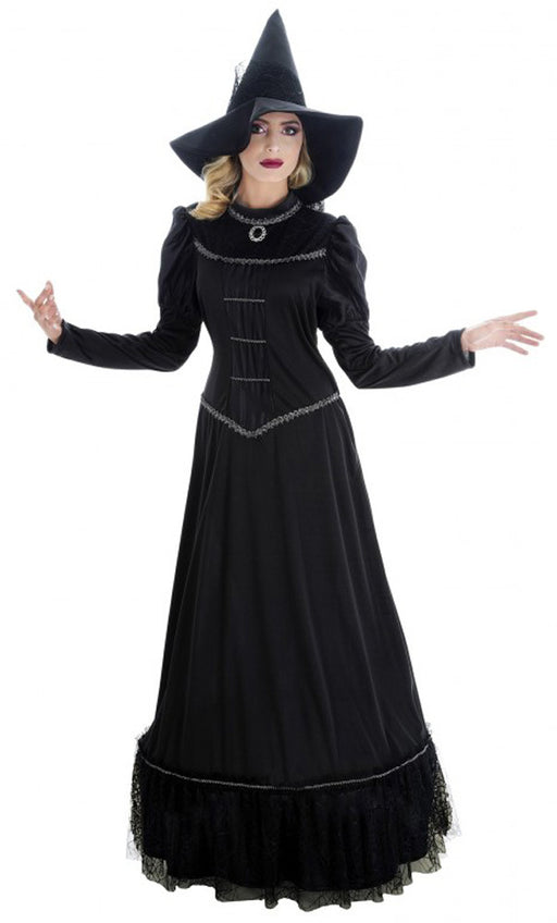 Vollständige Details anzeigenHexen Damenkostüm "Orelie" - Langes Kleid und Hexenhut | Schwarz Silber