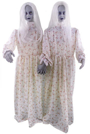 Die 130 cm großen, bleichen Horror Zwillinge haben weiße lange Haare und tragen ein geblümtes Kleid, das an ein Nachthemd erinnert. Bei der Animation drehen die Mädchen den Kopf und geben gruselige Geräusche von sich. Sie benötigen 3xAA Batterien, welche nicht im Lieferumfang enthalten sind.
