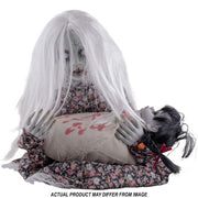 Dieses Mädchen mit weinendem Baby ist eine der schaurigsten Halloween-Dekorationen überhaupt – und nichts für schwache Nerven. Mit ihrem bleichen Gesicht, den leeren Augenhöhlen und den langen weißen Haaren wirkt sie, als sei sie direkt aus einem Albtraum in unsere Welt getreten. In ihren knochigen Armen hält sie ein weinendes Baby, dessen Schreie in Verbindung mit den unheimlichen Licht- und Bewegungseffekten für pure Gänsehaut sorgen.