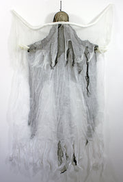 Der ca. 180 cm große Geist besteht aus einem Totenkopf und ist mit weißen und schwarzen Stofffetzen umhüllt. Links und rechts sind zwei Flügel mit weißen Lumpen angedeutet. Die Dekoration ist am Schädel mit einer Schlaufe versehen, mit der die Deko ganz einfach aufgehängt werden kann und so das freie Schweben vermittelt.
