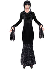 Sie möchten sich für die Karnevals- oder Halloweenparty als schauriges Dark Girl verkleiden? Dann dürfen Sie auf dieses gruselige Kostüm im Gothic-Look für Erwachsene auf keinen Fall verzichten. Das lange Kleid ist aus einem samtigen Material hergestellt und mit glitzernden Paillettenborten eingefasst. Die fransig geschnittenen Ärmel und der schmale Schnitt verleihen dem Kostüm einen glanzvollen Auftritt. Kombinieren Sie das Kleid mit einer passenden Perücke, um sich in ein schönes Dark Girl zu verwandeln.