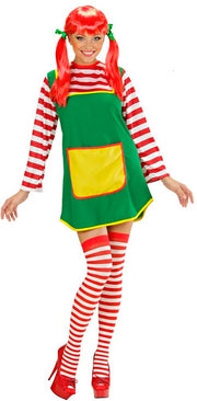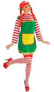 Das lustige freche Damenkostüm besteht aus dem grünen Kleid mit angenähter Bauchtasche und rot-weiß geringeltem Oberteil, das ebenfalls an dem Karnevalskostüm fest angenäht ist. Die lustig aussehende Freche Göre Perücke für Damen und tolle Ringelstrümpfe vervollständigen Ihren Look als Wirbelwind und machen Sie im Fasching zur Kultfigur.