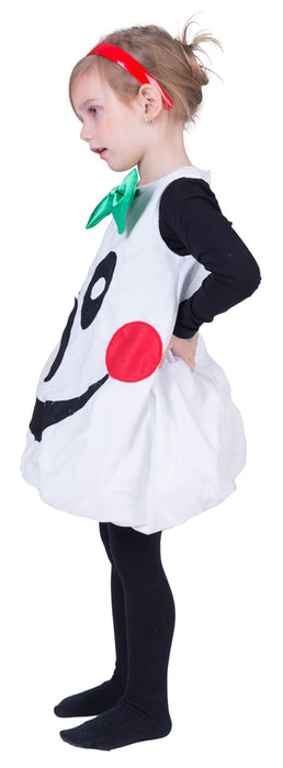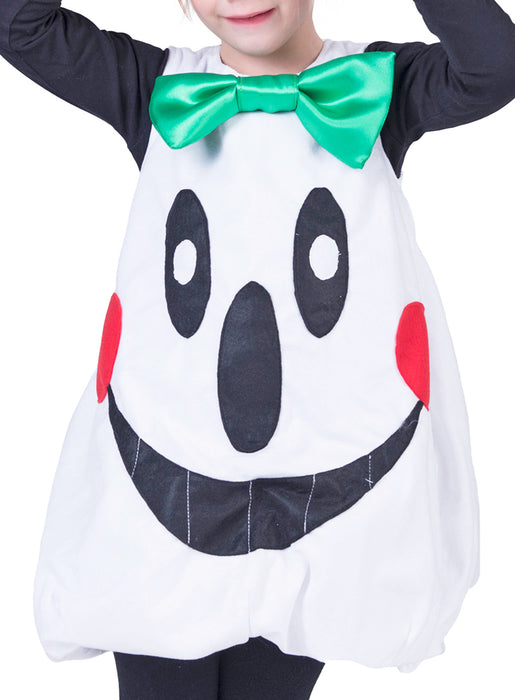 Das Kostüm besteht aus einem weißen Ballonkleid, das am Rücken mit einem Reißverschluss geschlossen wird. Auf der Vorderseite ist ein lustiges Geistergesicht mit roten Backen abgebildet und eine große grüne Schleife am Ausschnitt macht die Verkleidung komplett.