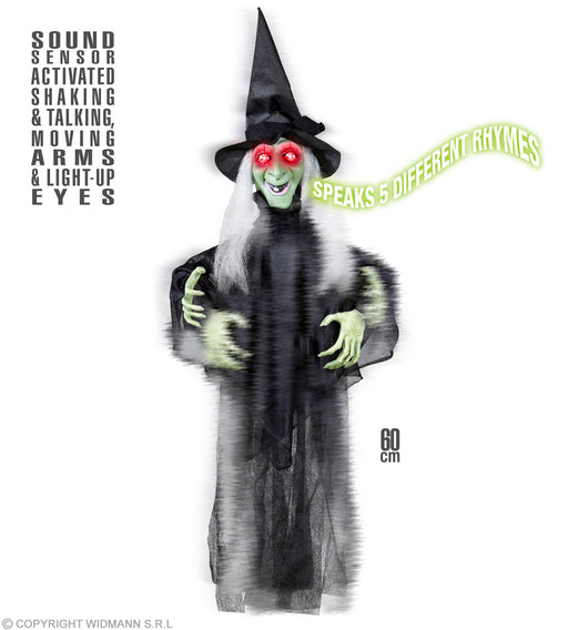 Vollständige Details anzeigenSprechende Hexe mit strampelnden Beinen und Leuchtaugen | Halloween Dekoration