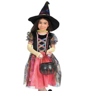Das Witch Kostüm für Kinder besteht aus einem schwarz pinken Kleid, welches am Rock und den Ärmeln mit schwarzem Tüll gearbeitet ist. Auf diesem tummeln sich verschieden farbig glänzende Spinnenweben und Spinnen, wodurch das Mädchenkostüm richtig auffällt. Abgerundet wird das Halloweenkostüm mit bunten, sich kreuzenden Bändern auf dem schwarzen Oberteil. Damit das Kinderkleid bequem an- und ausgezogen werden kann, ist im Rücken ein Reißverschluss angebracht. Der passende Spitz Hut ist natürlich ebenfalls im Lieferumfang enthalten - denn was wäre eine Hexe schon ohne Hexenhut!