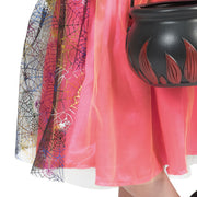Das Witch Kostüm für Kinder besteht aus einem schwarz pinken Kleid, welches am Rock und den Ärmeln mit schwarzem Tüll gearbeitet ist. Auf diesem tummeln sich verschieden farbig glänzende Spinnenweben und Spinnen, wodurch das Mädchenkostüm richtig auffällt. Abgerundet wird das Halloweenkostüm mit bunten, sich kreuzenden Bändern auf dem schwarzen Oberteil. Damit das Kinderkleid bequem an- und ausgezogen werden kann, ist im Rücken ein Reißverschluss angebracht. Der passende Spitz Hut ist natürlich ebenfalls im Lieferumfang enthalten - denn was wäre eine Hexe schon ohne Hexenhut!