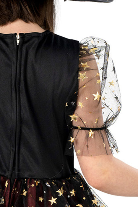 Das Kostüm besteht aus einem knielangen Kleid in Schwarz und Rot sowie einem passenden Hexenhut. Das Kleid ist ein echter Blickfang: Die kurzen, schwarzen Tüllärmel sind mit goldenen Sternen geschmückt, was dem Outfit einen geheimnisvollen und funkelnden Akzent verleiht. Das Oberteil ist in elegantem Schwarz gehalten und mit einem auffälligen roten Satinband verziert, das den Look besonders edel wirken lässt.