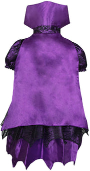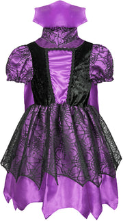 Das hübsche Kleid besteht aus einem glänzenden Stoff in Satinoptik, mit einer zweiten Lage aus Tüll im Spinnennetz Design. Der Umhang mit dem zum Kleid passenden Stehkragen gibt dem Kostüm den letzten Schliff und macht Ihr Kind zum Hingucker auf jeder Party.