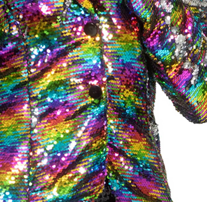 Das Jackett ist mit bunten Pailletten in regenbogenfarbenen Pailletten besetzt, die im Discolicht herrlich funkeln und glänzen.