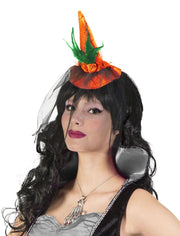 Vervollständigen Sie Ihr Hexen, Zauberin, Magierin oder Spinnenfrau Kostüm zu Halloween, Karneval oder Mottoparty mit diesem süßen Hexenhut im Miniformat! Der Minihut ist an einem Haarreif befestigt und mit einem schwarzen Schleier, Blumen und Federn verziert. Er passt somit perfekt zu vielen Kostümen und rundet Ihre Verkleidung super ab.