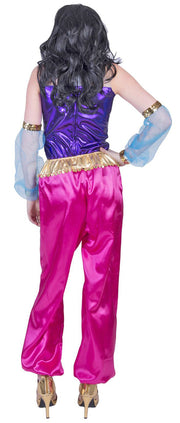 Dieses märchenhafte Kostüm besteht aus Top, Hose, Armstulpen und Kopfschleier. Das glänzende lila Top wird am Dekolleté von einer goldfarbenen Borte und einer roten Rüsche verziert. Die Borte findet sich bei den Trägern wieder. Die pinke Pumphose in Satinoptik hat am Bund einen goldenen Einsatz, der zusätzlich mit Münzelementen veredelt ist und so wie ein Gürtel wirkt.