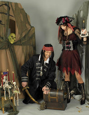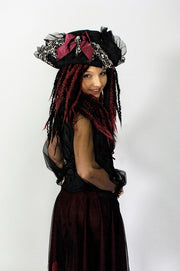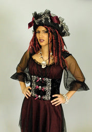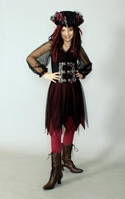 Passend zum Kleid wird ein schicker Piratenhut mitgeliefert. Das Kleid ist in einem dunkelroten Stoff gehalten und mit einer schwarzen Lage Tülllage veredelt. Oberhalb der Tülllage befindet sich ein Mieder, welches aus schwarzem Samt besteht und mit kleinen Totenköpfen verziert ist.