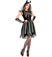 Unsere Teufelsbraut Skeletta sucht einen heiratswilligen dämonischen Bräutigam, der ein Herz für eine untote Seele hat. Das teuflische, kurze Brautkleid ist in Schwarz gehalten und mit einem Skelettaufdruck gearbeitet. Passend dazu werden auch noch die fingerlosen Handschuhe und der schwarze Brautschleier mit Hörnern geliefert. Mit etwas Schminke, gruseligen Kontaktlinsen und vielleicht noch etwas Kunstblut können Sie dieses schaurige Halloween-Kostüm noch perfekt abrunden.