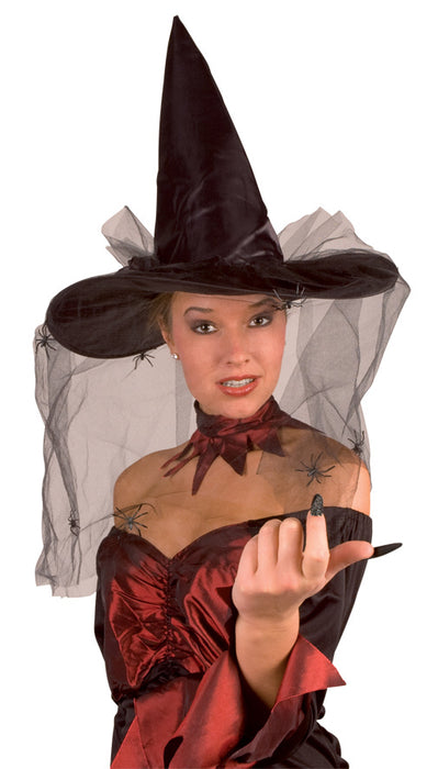Wunderschön gearbeiteter schwarzer Hexenhut für Halloween und Karneval! Der ausgefallene Hut ist mit einem spinnenbesetzten Schleier und einer Stoffblume gearbeitet. Er ist aus einem sehr schönen Satin-Material hergestellt.