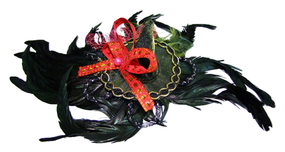 Exklusiver, sehr schöner Hexenhut für Erwachsene. Der Minihut ist aus grünem Samtmaterial hergestellt und mit schwarzen Federn, einer roten Schleife und Tüll verziert.