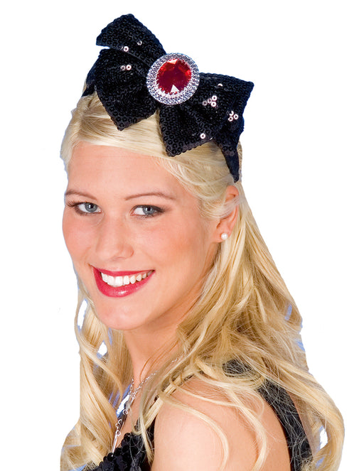 Schöner Haarreif zu Ihrem Party oder Karnevals Outfit! Der Haarreif ist mit einer großen Paillettenschleife besetzt und mit einem großen roten Schm...