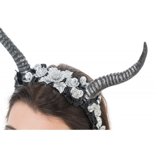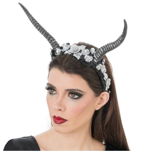 Vollständige Details anzeigenHaarreif mit Hörnern, Blumen und Totenkopf | Schwarz/Weiß